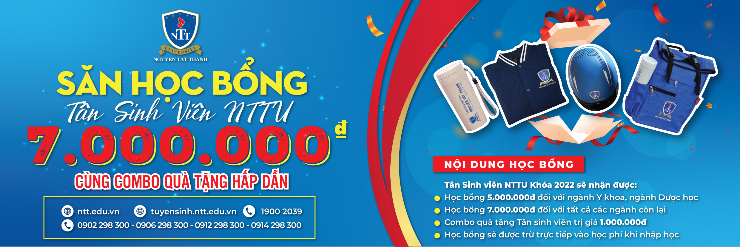 Ngoài ra, 2.000 Tân sinh viên khóa 22 (Đại học chính quy), khi nhập học tại trường Đại học Nguyễn Tất Thành trước ngày 05/8/2022 sẽ nhận được các suất học bổng giá trị cùng “combo” quà tặng hấp dẫn như sau: