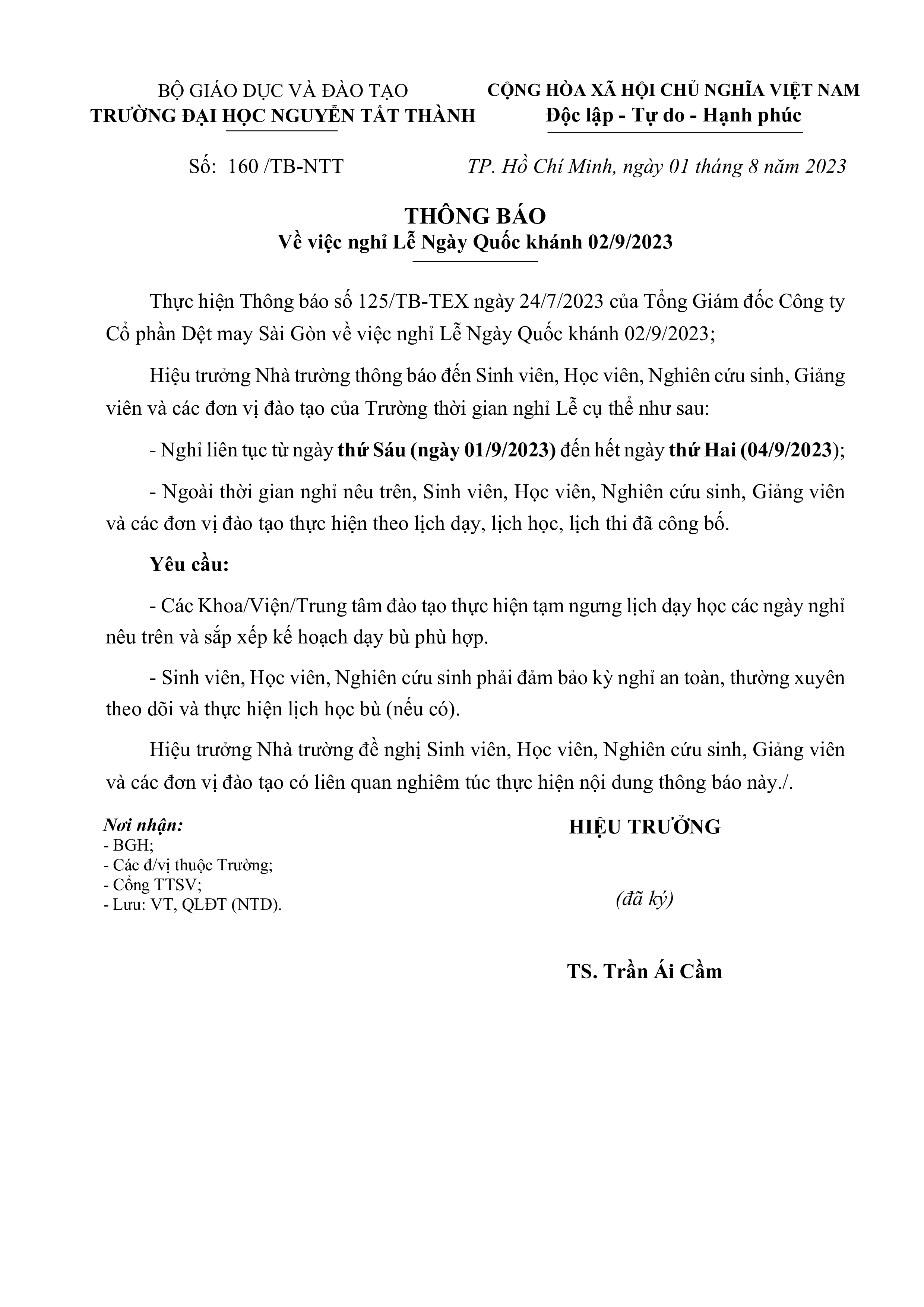 [Thông Báo] Về Việc Nghỉ Lễ Quốc Khánh Nước CHXHCN Việt Nam (2/9) [Thông Báo] Về việc nghỉ Lễ Quốc khánh nước CHXHCN Việt Nam (2/9) – Nghỉ liên tục từ Thứ sáu ngày 01/09/2023 đến hết Thứ hai ngày 04/09/2023. – Ngoài thời gian nghỉ nêu trên, Sinh viên, Học viên thực hiện theo lịch học, lịch thi được công bố.