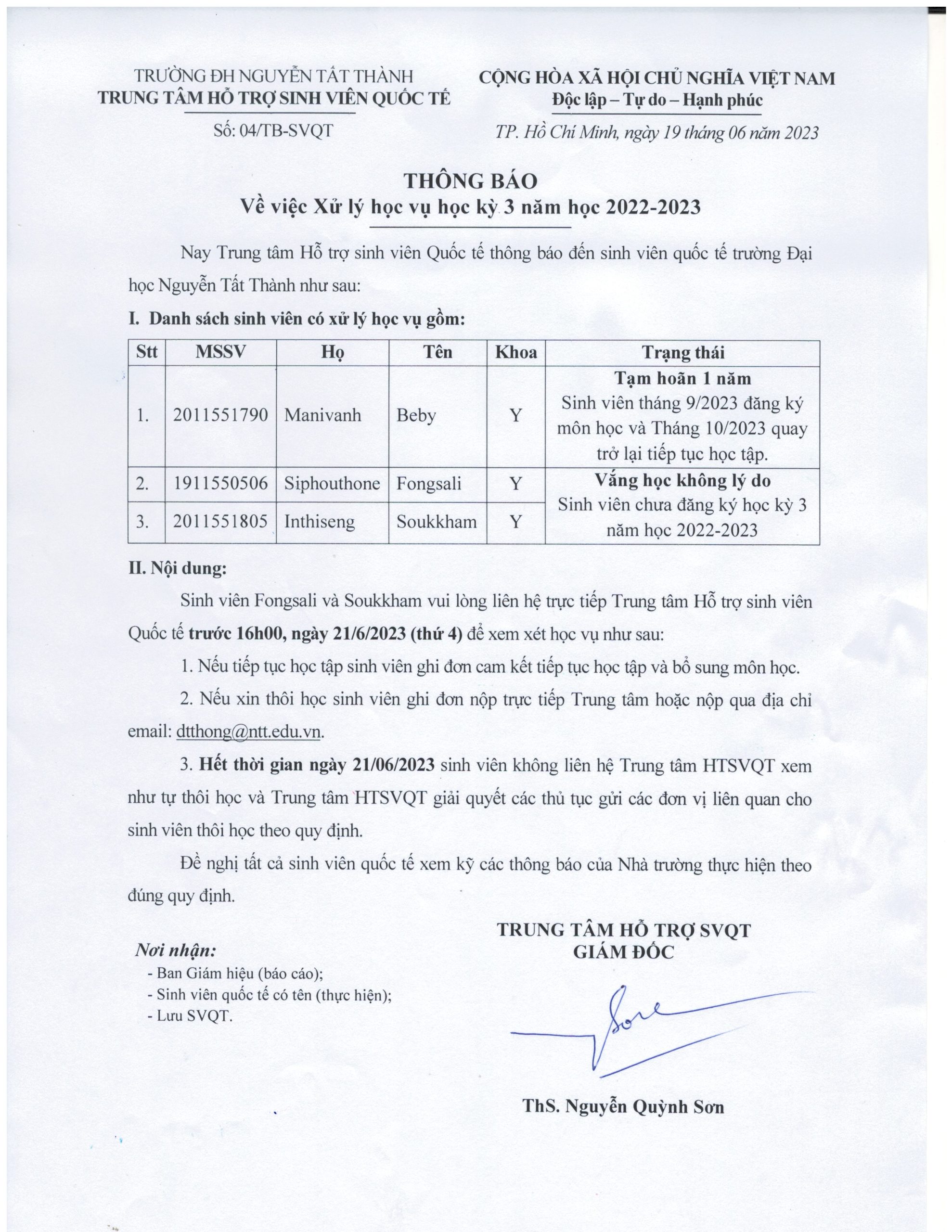 Sinh viên Fongsali và Soukkham vui lòng liên hệ Trung tâm Hỗ Trợ Sinh Viên Quốc Tế trước 16h00, ngày 21/6/2023 (thứ 4) để xem xét và giải quyết học vụ.